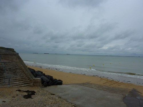 Au loin les vestiges du port artificiel construit en seulement dix jours par les anglais pour assurer le ravitaillement des troupes après le débarquement.
